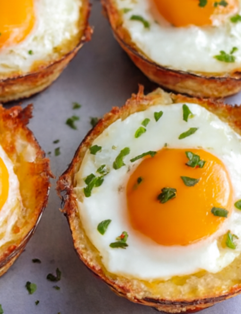 - Press the potato mixture into each muffin cup, forming a nest shape, and bake for 15-20 minutes, or until the edges are golden and crispy.