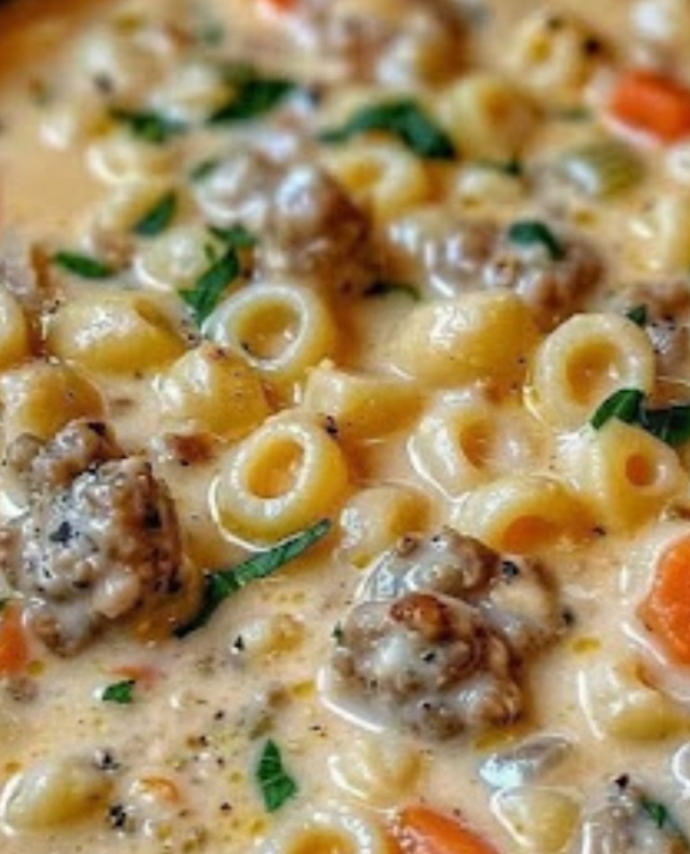 In a large soup pot over medium heat, cook the sausage until browned. Break it up into bite-sized pieces as it cooks. Remove excess grease if necessary.