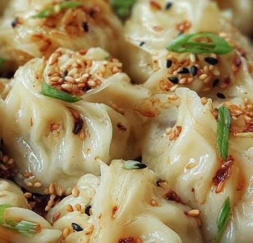 - Once the dumplings are cooked, garnish with sesame seeds and chopped green onions.