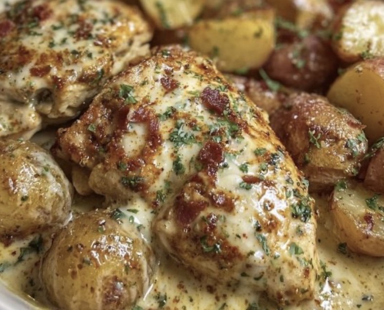 Pour the garlic-Parmesan cream sauce evenly over the chicken and potatoes.