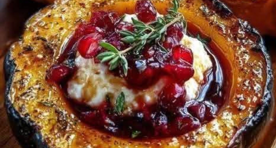 Honey-Glazed Acorn Squash with Creamy Goat Cheese and Cranberry Drizzle