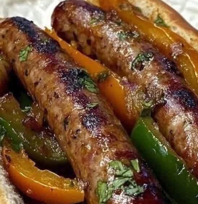 A robust, savory dish featuring juicy Italian sausages paired with sweet bell peppers, caramelized onions, and creamy garlic mashed potatoes.
