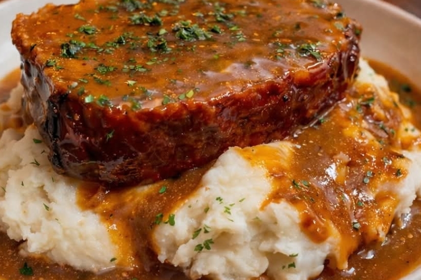 Serve thick slices of meatloaf over creamy mashed potatoes and generously spoon warm gravy on top.