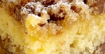 It looks like a soft apple crumb cake (Szarlotka / Apple Streusel Cake) with powdered sugar and a buttery crumble…