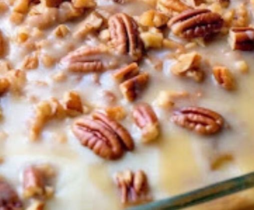 While the cake is still warm, melt butter and sweetened condensed milk in a saucepan over medium heat. Stir constantly until the butter has melted. Remove from heat and stir in 1 cup chopped pecans.