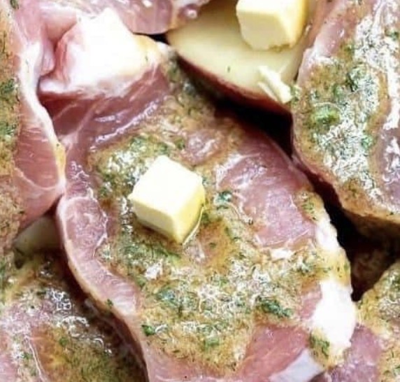 Place quartered red potatoes and pork chops in the slow cooker. Pour the ranch mixture over them and toss to ensure even coating of the potatoes.