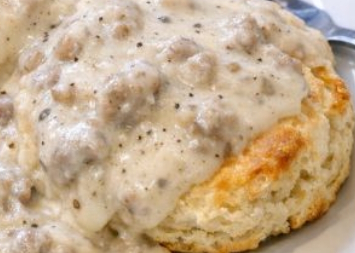 If you’d like to dress this up a little without losing its simple charm, there are plenty of options. For a richer biscuit, brush the tops with a bit of melted butter just before or right after baking. If you prefer a lighter gravy, use part milk and part water, the way many farm kitchens did when stretching the morning’s milk. A pinch of crushed red pepper or extra black pepper in the sausage as it cooks gives the gravy a gentle kick, while a small handful of shredded cheese stirred into the finished gravy makes it extra cozy on cold mornings. You can also swap in turkey sausage or a leaner blend if that’s what you keep on hand; just add a spoonful of butter or oil if the pan looks too dry before adding the flour. For smaller households, bake half the biscuits and freeze the shaped, unbaked rest—then you can pull a few from the freezer and bake them straight from frozen on another morning, adding a couple of extra minutes to the baking time. And if you ever find yourself with leftover gravy, it’s lovely spooned over fried potatoes or a slice of toast the next day, a quiet reminder of yesterday’s breakfast lingering into today.
